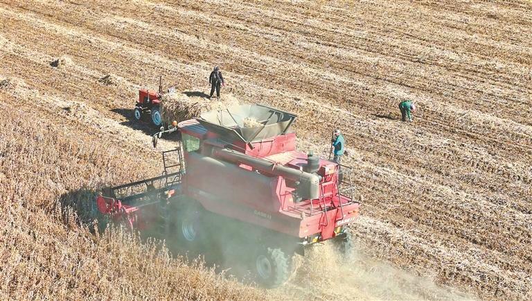 “今年大豆喜获丰收,亩产超过500斤。”合作社负责人田树君介绍,合作社今年共种植大豆8300亩,通过科学种植推动大豆单产提升,将种植垄距从1.3米调整为1.1米密植方式,有效提高了土地利用效率,还便于农机具种植与收割。今年大豆亩产较往年增产80斤左右,打破了合作社大豆单产纪录。合作社还种植黏玉米3780亩、黄玉米3000亩,通过改进种植技术、优化种子选育,玉米产量也创下历史新高,亩产突破2000斤,玉米产量突破“吨粮”大关。